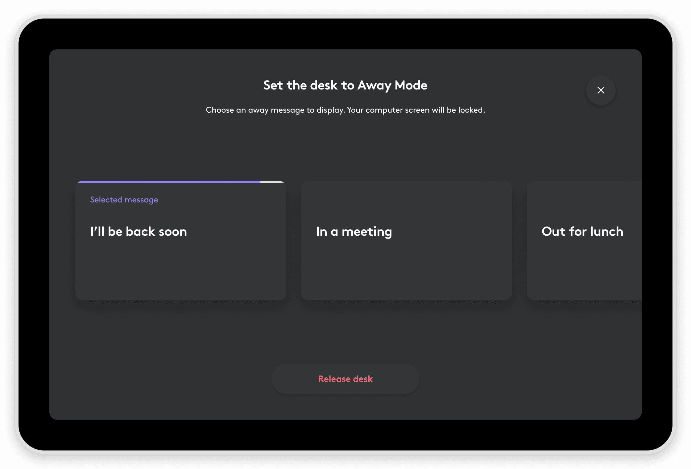 Employees never have to worry about losing their seat. Logi Dock Flex clearly indicates that the desk is taken, even when the computer is unplugged. They can quickly choose from handy predefined messages or create their own.